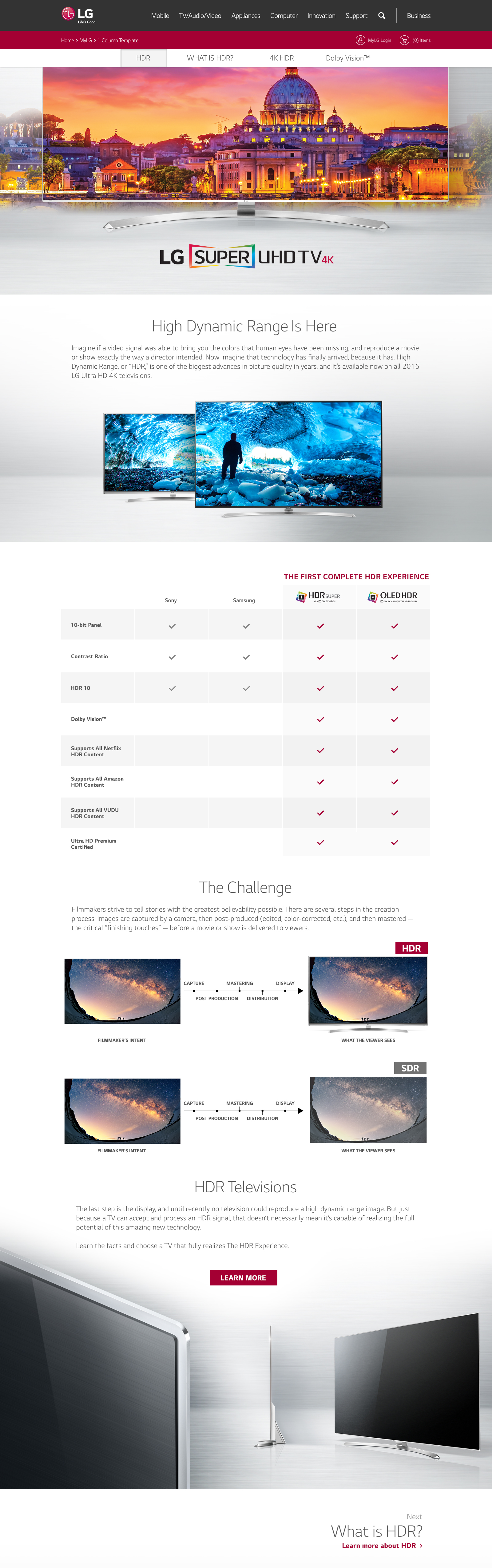This page was created to introduce consumers to Super UHD televisions with HDR, specifically positioning them against the competition.