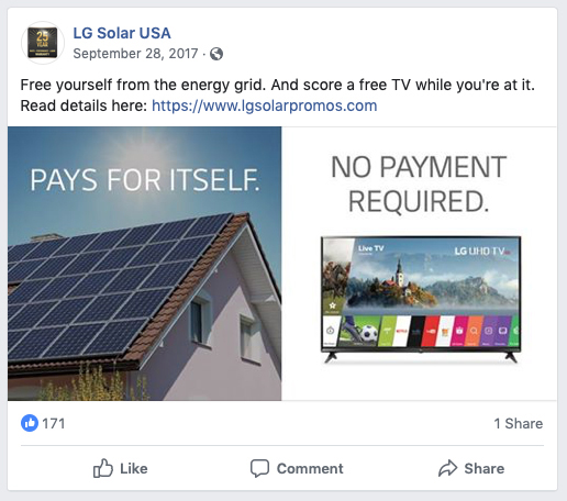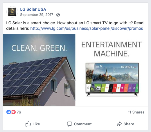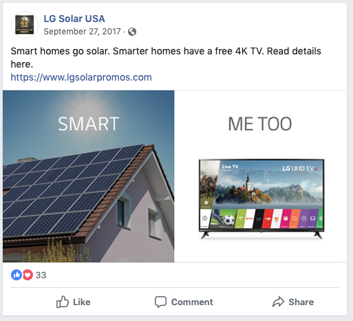 For a special promotion (buy an LG Solar setup, receive a free LG Smart TV), we were tasked with creating fun, very short yet very compelling social posts. (The first one is my favorite.)